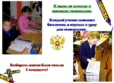 В 2007-2008 годах в нашей стране проходили выборы (сначала выборы в Государственную думу, а в марте 2008 г. – выборы президента). Эти события широко обсуждались в СМИ. На уроках окружающего мира в этот период изучались темы из раздела «Человек – член общества».