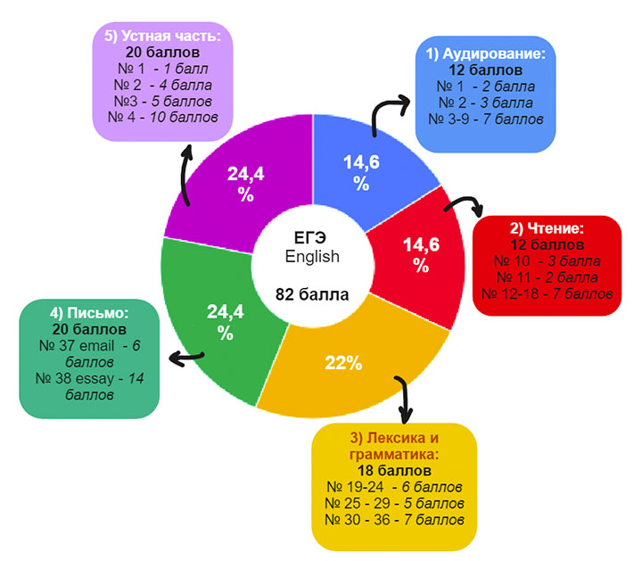 - Пишем (Письменная речь): 2 задания. Письмо другу и эссе – показать, что умеешь выражать мысли на бумаге. Максимум за письменную часть – 80 баллов.