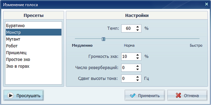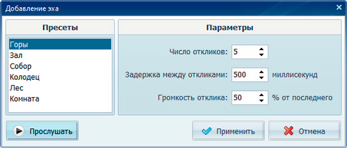 Нажимаем «Прослушать». Если эффект понравился, то сохраняем с помощью кнопки «Применить» – все очень просто.