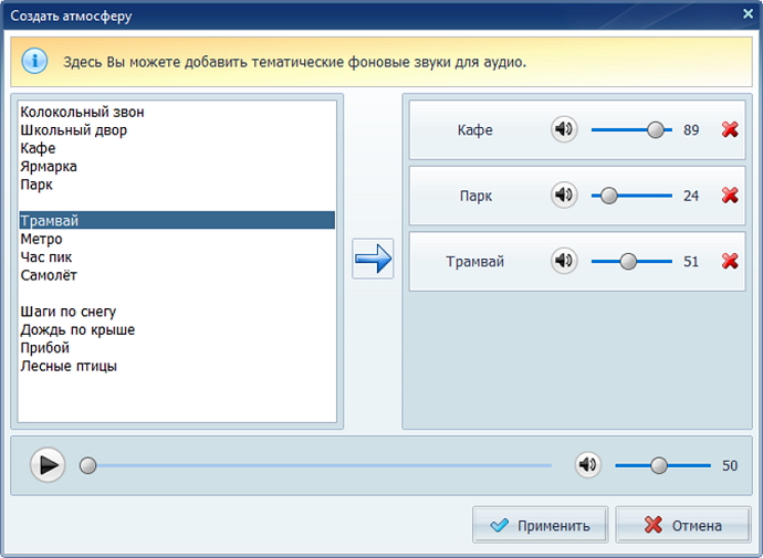 Кроме эхо-эффектов, в программе можно добавить разные фоновые звуки. Ваш Робот на видео в лесу слушает пение птиц? Добавляем эффект лесные птицы. Вдруг начался дождь? Наложите звук дождя – и видео станет более реалистичным. Любой из этих фоновых пресетов – голоса, смех, звуки природы, шум машин – придадут аудио атмосферности. Ребенок точно будет доволен!