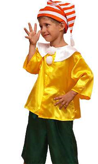 Ученик, одетый в костюм Буратино, проводит зарядку.