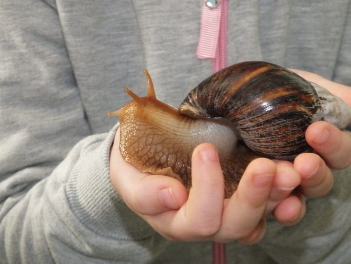 Длина африканских сухопутных улиток ахатин достигает 30 сантиметров. Тело разделяется на голову, раковину и ногу. Рот улитки (радула) оснащен языком с теркой, с помощью которой она и питается. В основном они едят овощи и все фрукты, кроме цитрусовых. Также улитки предпочитают в своем рационе кальций. Он очень полезен для качества их ракушки.