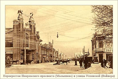 Екатеринбург – город театральный. Перекресток Вознесенского и главного проспектов называют театральным. Это место для строительства первого театрального здания для труппы П.А. Соколова определил лично генерал Глинка. Деньги на строительство выделили купцы Яким и Аникий Рязановы при участии М.И. Коробова и Г.Ф. Казанцева. 29 октября 1847 года в новом здании был дан первый спектакль. 7 ноября 1896 года здесь состоялся один из первых сеансов кинематографа в нашем городе. А с 1912 года кинематограф обосновался здесь навсегда. Через два года городской театр получил имя «Колизей».