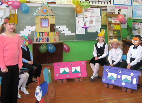 Книжная выставка: «С детства дружбой дорожи!», музыкальные записи, шары, нарисованный паровозик, домик, ступеньки с законами дружбы, карточки с пословицами, презентация «Праздник Дружбы», мультфильм «Приключения кота Леопольда».