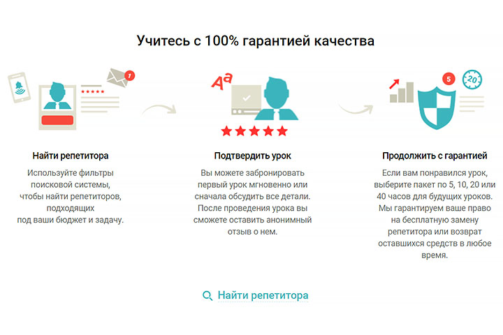 Многие считают, что такой вариант несет угрозу потери денег или недобросовестного отношения репетитора к работе. Конечно, эти аргументы имеют почву, если искать преподавателя вслепую на просторах интернета. Но речь идет о поиске преподавателя через платформу, которая выступает регулятором в отношениях репетитор-ученик и помогает избежать финансовых потерь или низкого качества преподавания.
