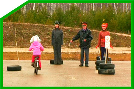 Звучит песня «Кручу педали, кручу» (Музыка Б. Савельева, слова А. Хайт). Товарищ милиционер требует четкого соблюдения ПДД. Указывает на знаки. Делает замечания нарушителям.