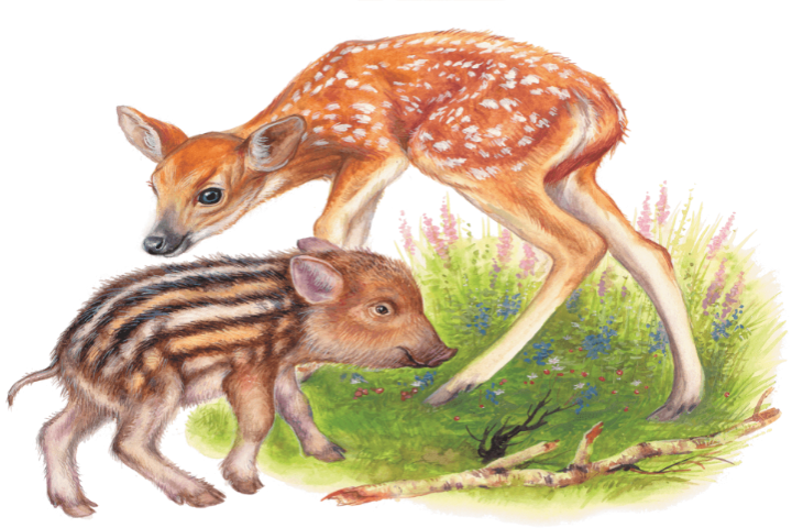 Встретились на поляне двое малышей: Косулёнок — лесной козлёночек и Кабанчик — лесной поросёнок. Нос к носу встали и разглядывают друг дружку. — Ой, какой смешной! — говорит Косулёнок. — Весь полосатый-полосатый, будто тебя нарочно раскрасили! — Ой, а ты до чего смешной! — говорит Кабанчик. — Весь в пятнышках, будто тебя нарочно забрызгали! — Я в пятнышках для того, чтобы лучше в прятки играть! — сказал Косулёнок. — И я полосатый, чтобы лучше в прятки играть! — сказал Кабанчик. — С пятнышками лучше прятаться! — Нет, с полосками лучше! — Нет, с пятнышками! — Нет, с полосками! И заспорили, и заспорили! Ни один уступить не хочет. * * * А в это время затрещали сучья, захрустел валежник. Вышла на поляну Медведица с медвежатами. Увидел её Кабанчик — и стреканул в густую траву. Вся трава полосками, полосками, — исчез в ней Кабанчик, словно сквозь землю провалился. Увидел Медведицу Косулёнок — и стрельнул в кусты. Между листьями солнце пробивается, везде жёлтые пятнышки, пятнышки, — исчез в кустах Косулёнок, словно его и не было. Не заметила их Медведица, прошла стороной. Значит, оба хорошо научились в прятки играть. Зря спорили. |