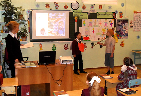 На уроке обобщаются знания, полученные на предыдущих уроках, проводится беседа-опрос по сказке Джанни Родари «Приключения Чиполлино». Была проведена подготовительная работа по представлению детьми на уроке театрализованного представления с целью «оживить» урок, сделать его эмоционально окрашенным, ярким, интересным. А также в роли соведущего выступил ученик класса.