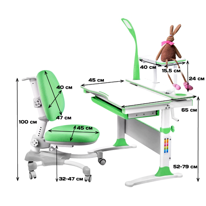 В него входят не только парта, но еще удобное кресло эргономичной формы также с регулировкой высоты, изящная настольная лампа LED с тремя режимами освещения и сенсорной регулировкой яркости и полка для книг. В общем, всё сделано для сохранения здоровья маленького ученика и для того, чтобы он получал удовольствие от процесса обучения.