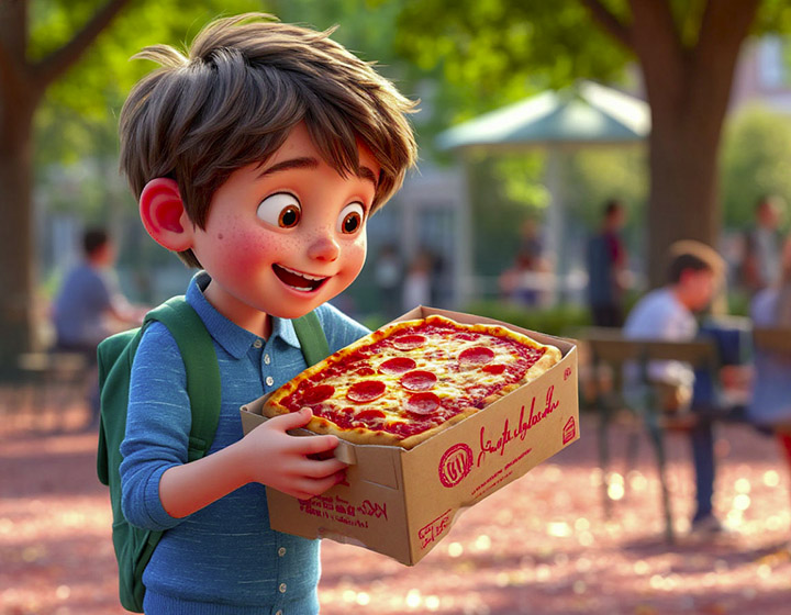 Дайте волю фантазии! Тертая моцарелла, кусочки запеченной куриной грудки, тонкие ломтики кабачка, соцветия брокколи, сладкий перец соломкой. Пусть ребенок сам создаст свой шедевр!
