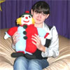Игрушка связана спицами из шерстяной пряжи разных цветов.