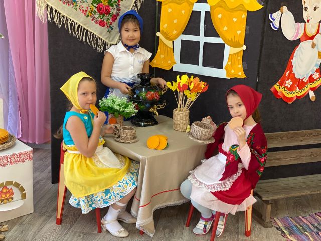Благодаря воспитателю Хивриной А.И. и воспитателю высшей категории Халимовой Е.В. зал был украшен в русско-народном стиле, что поспособствовало привитию этического вкуса детям и их проникновению в быт и культуру русского народа.
