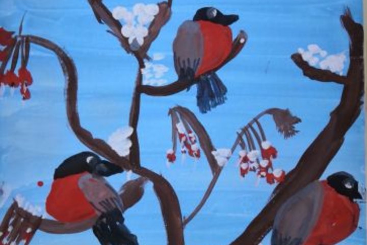 Славная работа для ученицы второго класса. На синем фоне белый снег смотрится чудесно! И снегири получились забавные, упитанные и довольные ))