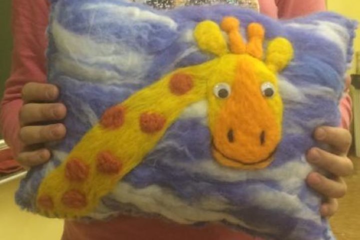 Катя занимается к кружке первый год. Работа выполнена из натуральной шерсти в технике мокрого валяния (полотно подушки) и сухого валяния (рисунок) на занятии кружка.