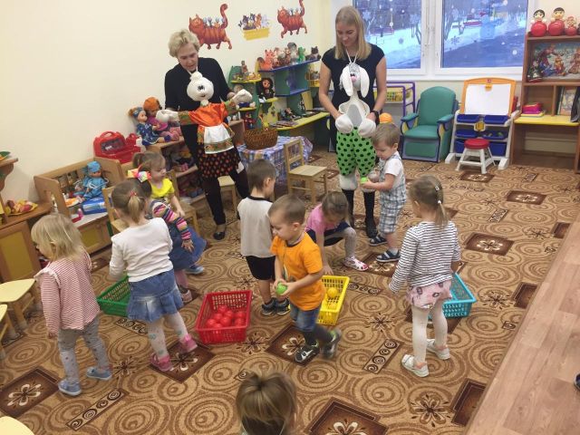 Дети разбирают разноцветные шарики в корзины соответственного цвета.