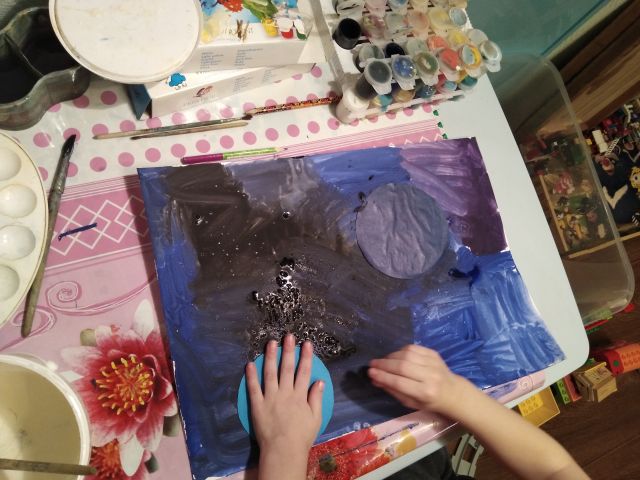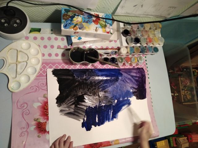1. Сначала рисуем фон. Берём синюю, чёрную, фиолетовую гуашь и закрашиваем лист.