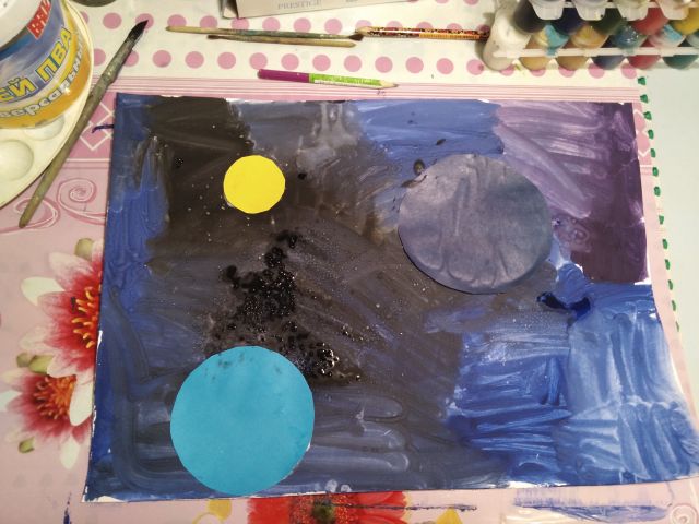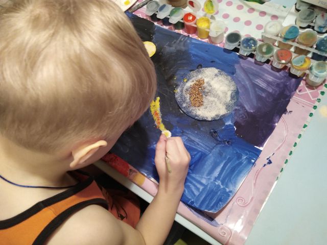 Материалы: лист А4 или А3 (можно нестандартный), гуашь, кисть, вырезанные из цветной бумаги или картона планеты, различная крупа, клей (лучше ПВА), ватные палочки или зубная щетка.