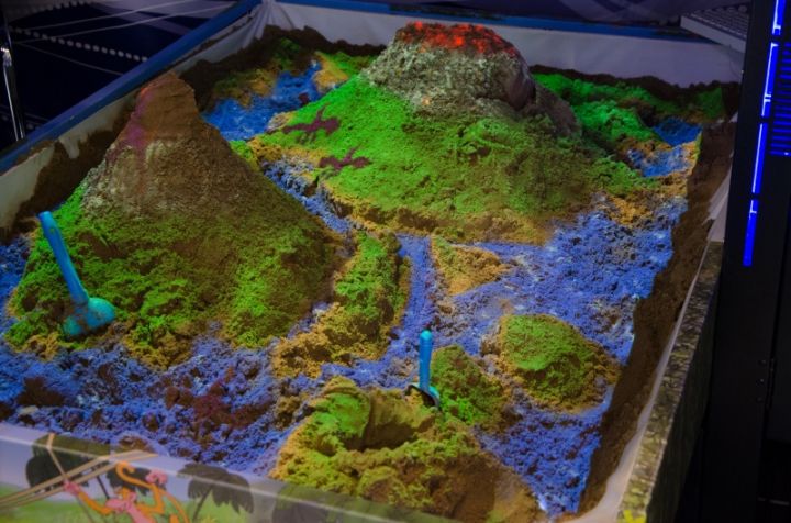 На данном этапе занятия познавательного цикла используются некоторые из 13 режимов интерактивной песочницы. «Карта высот» - когда дети «строят» Землю с горами, реками, морями, озерами, пустынями, и планета с помощью компьютера и проектора окрашивается в различные цвета; «Вулкан» - когда малыши создают из песка высокую гору, извергающую лаву и выпускающую дым; «Шары» - когда песочница превращается в игровое поле и ребята лопают шары нужного цвета, чтобы набрать наибольшее количество очков.